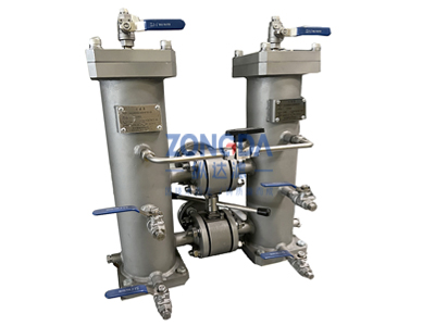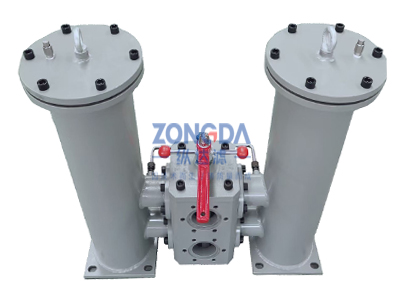 雙筒過濾器,也叫雙并聯(lián)過濾器,由兩個單筒過濾器及換向閥組成,在工作過程中,單筒過濾器濾芯堵塞需要換濾芯時,可以轉(zhuǎn)動換向閥切換到另外一個單筒過濾器繼續(xù)工作,實現(xiàn)不停機的情況下更換濾芯,保證主機正常連續(xù)工作。